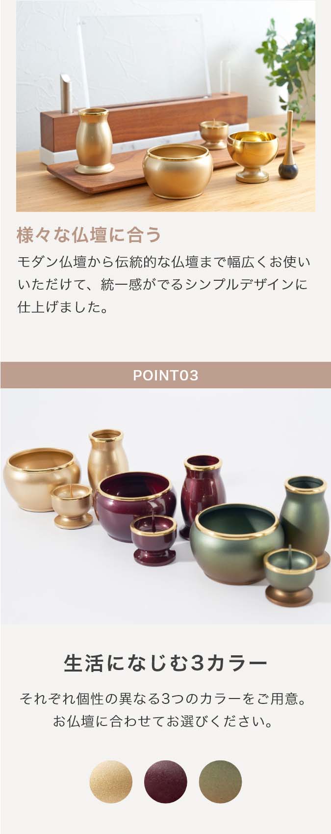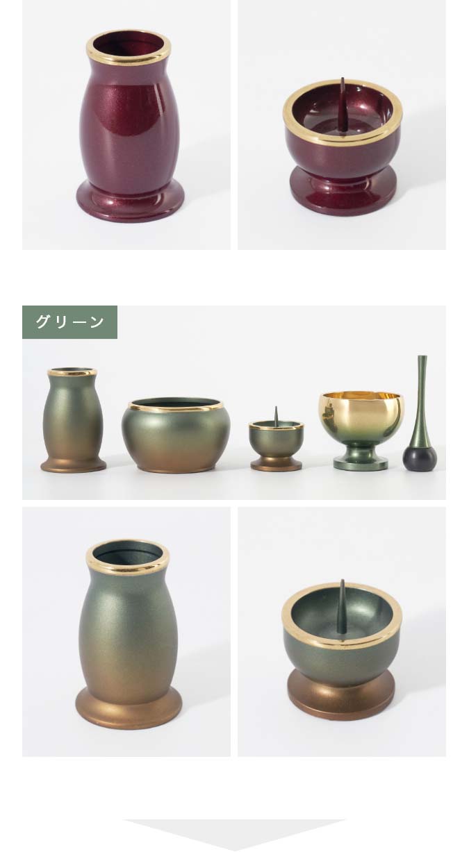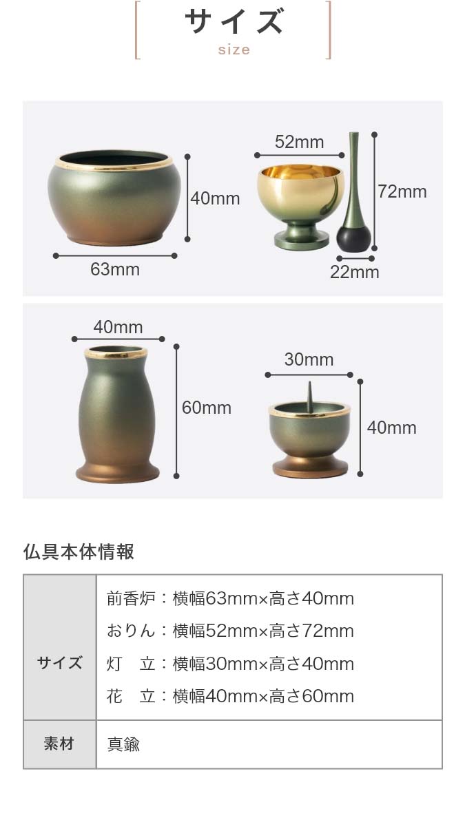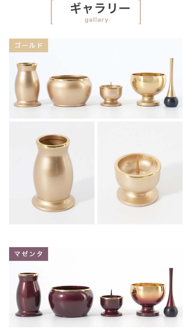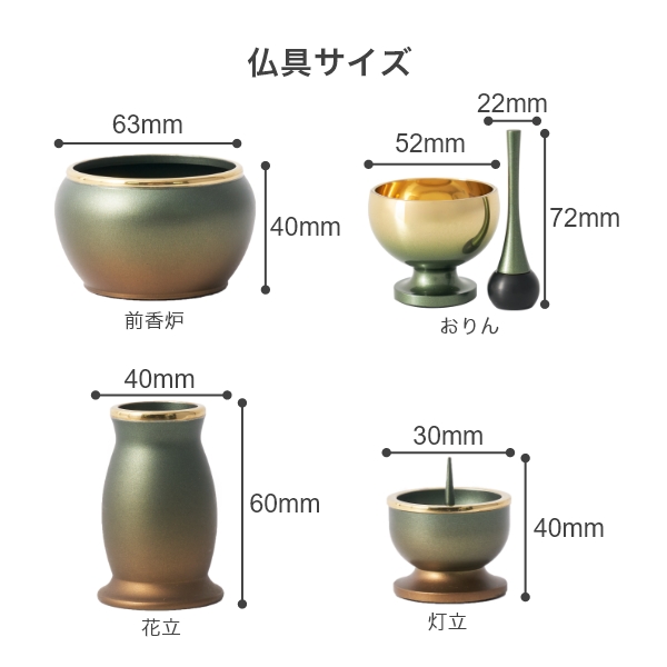 2寸サイズの3具足・りんセットです。 光沢を抑えた塗装が幽玄さを醸し出します。 付属内容:灯立、花立、前香炉、リンセット 推奨仏壇サイズ:ステージ仏壇