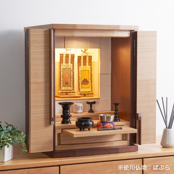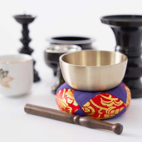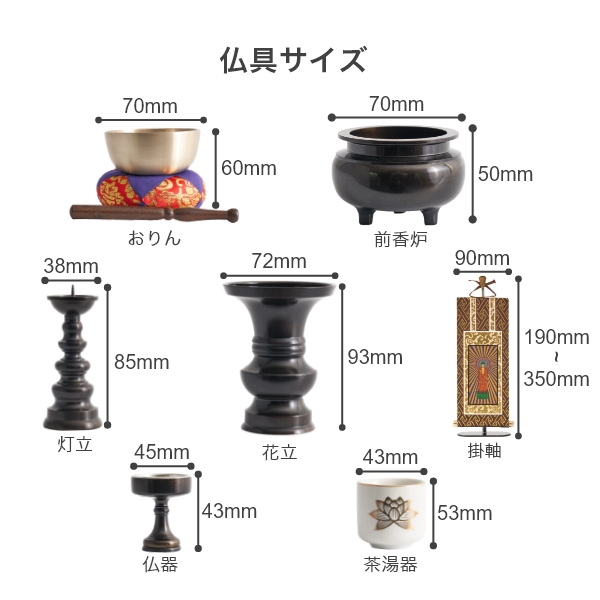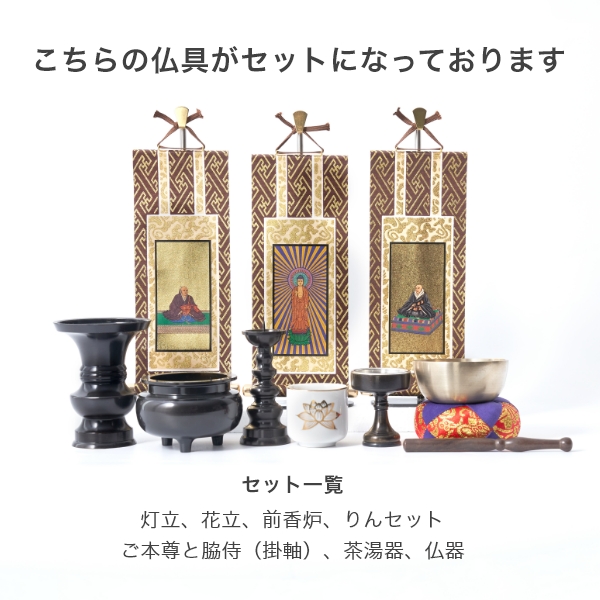 仏具セット「静寂」の9点セットです。 伝統的な意匠を凝らした、美しい形をした仏具です。 付属内容:灯立、花立、前香炉、りんセット、ご本尊と脇侍(掛軸)、茶湯器、仏器 +10,000円でご本尊の掛け軸を仏像に変更いただけます。 推奨仏壇サイズ:15号以上
