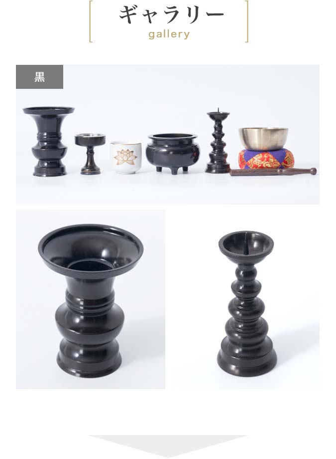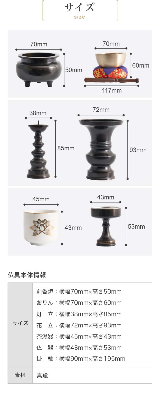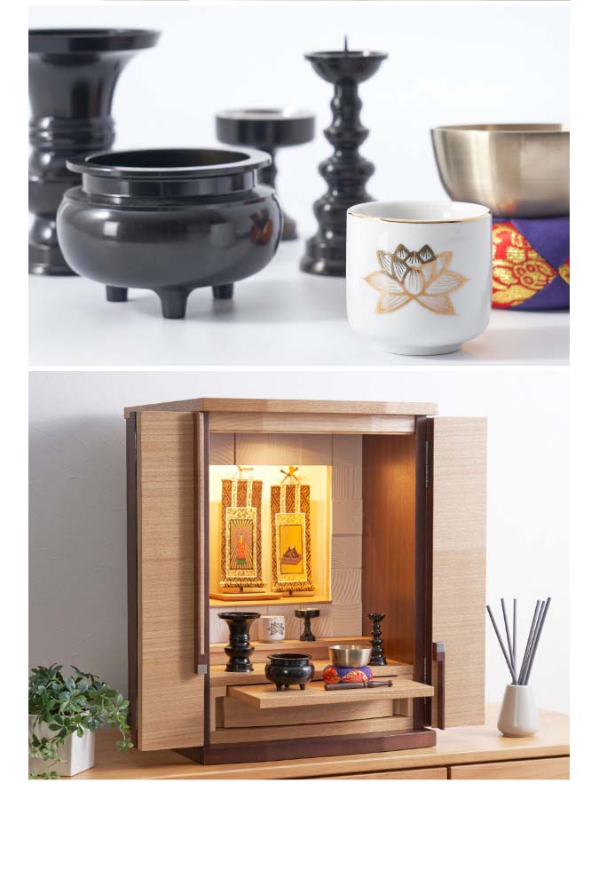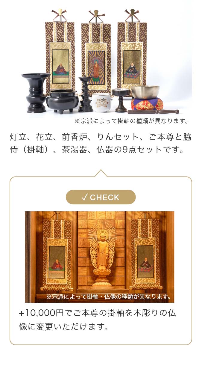 仏具セット「静寂」の9点セットです。 付属内容:灯立、花立、前香炉、りんセット、ご本尊と脇侍(掛軸)、茶湯器、仏器 +10,000円でご本尊の掛け軸を仏像に変更いただけます。 推奨仏壇サイズ:15号以上