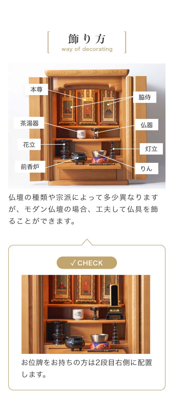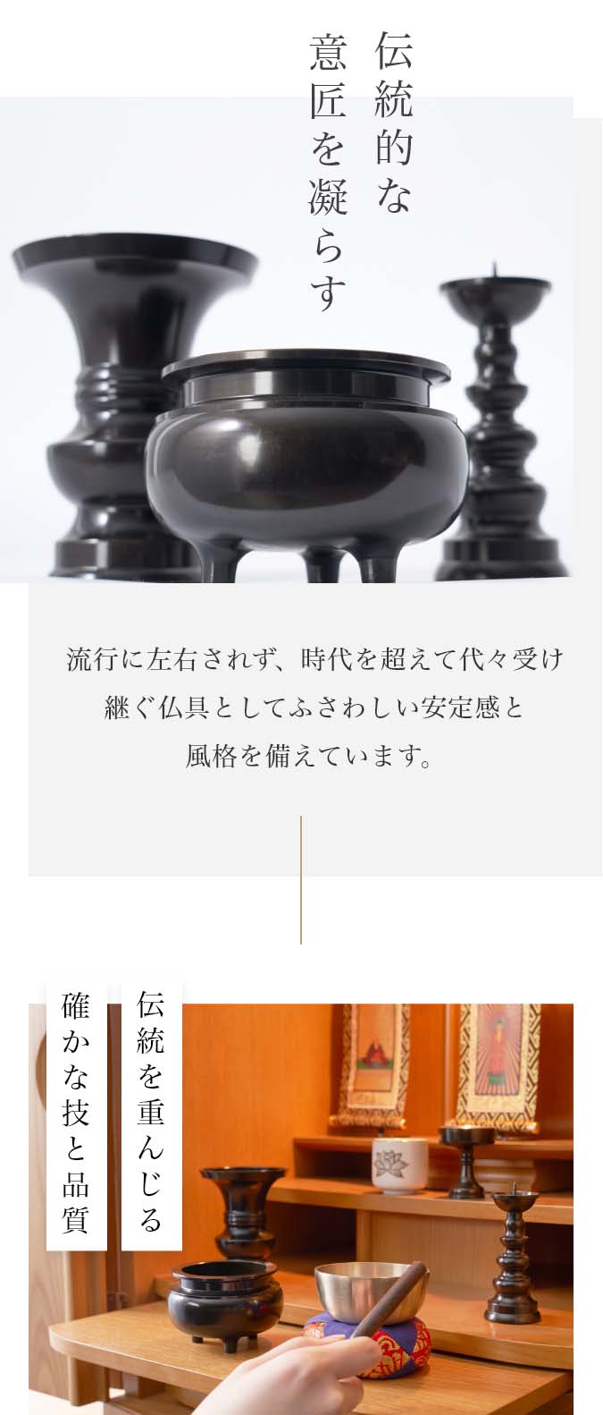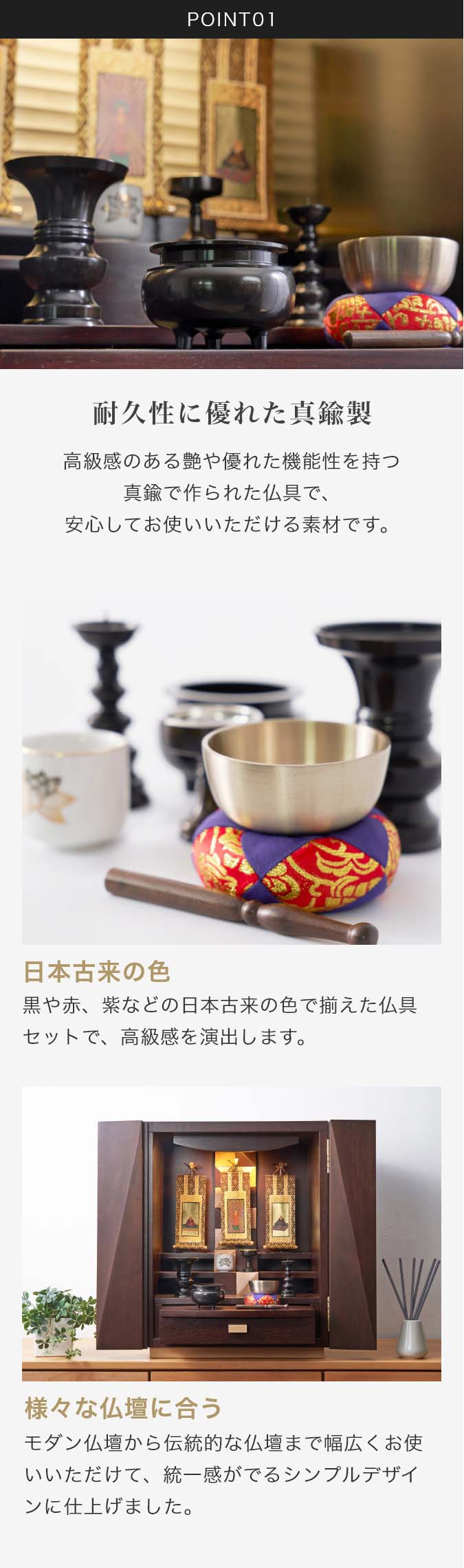 仏具セット「静寂」の9点セットです。 付属内容:灯立、花立、前香炉、りんセット、ご本尊と脇侍(掛軸)、茶湯器、仏器 +10,000円でご本尊の掛け軸を仏像に変更いただけます。 推奨仏壇サイズ:15号以上