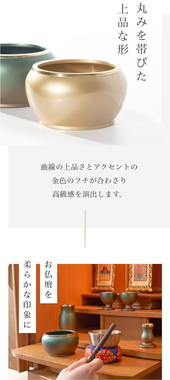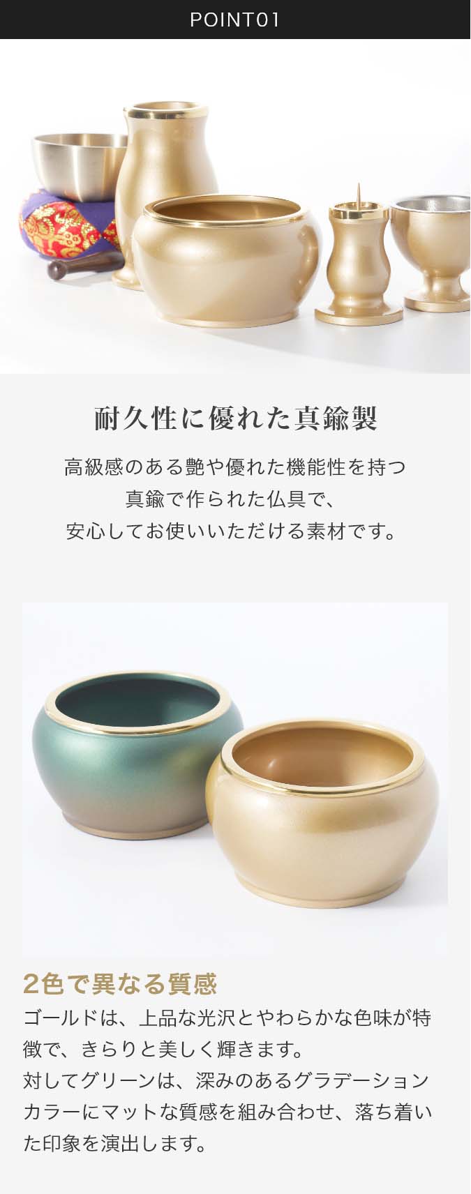 ズッシリとした重量感が良い品物だと想わせてくれます。ゴールドかグリーンかで迷いましたが、渋い緑色が仏壇のライト色にマッチするグリーンにして良かったと思っています。