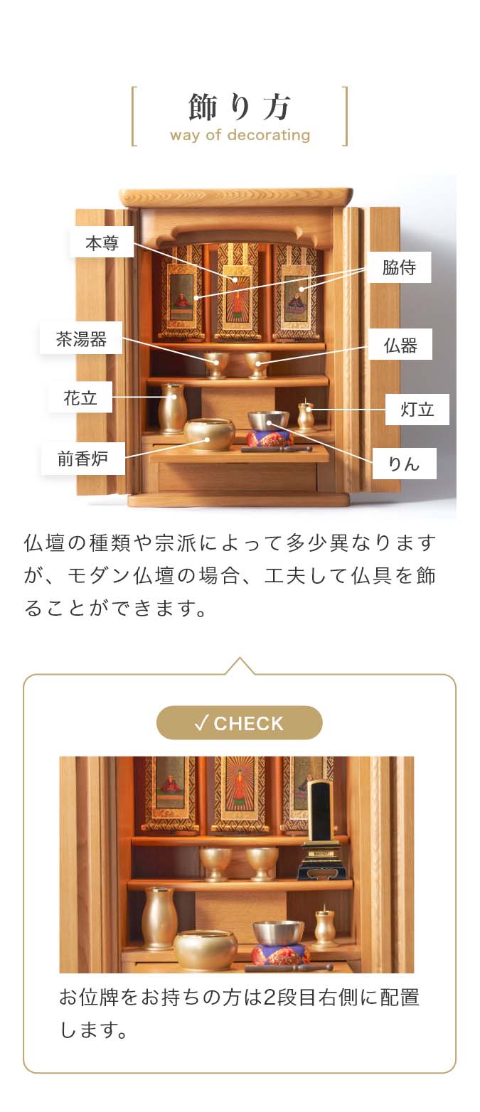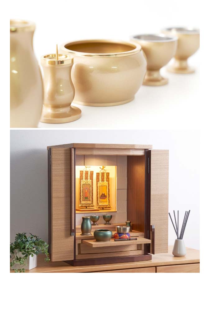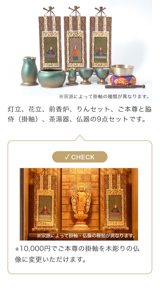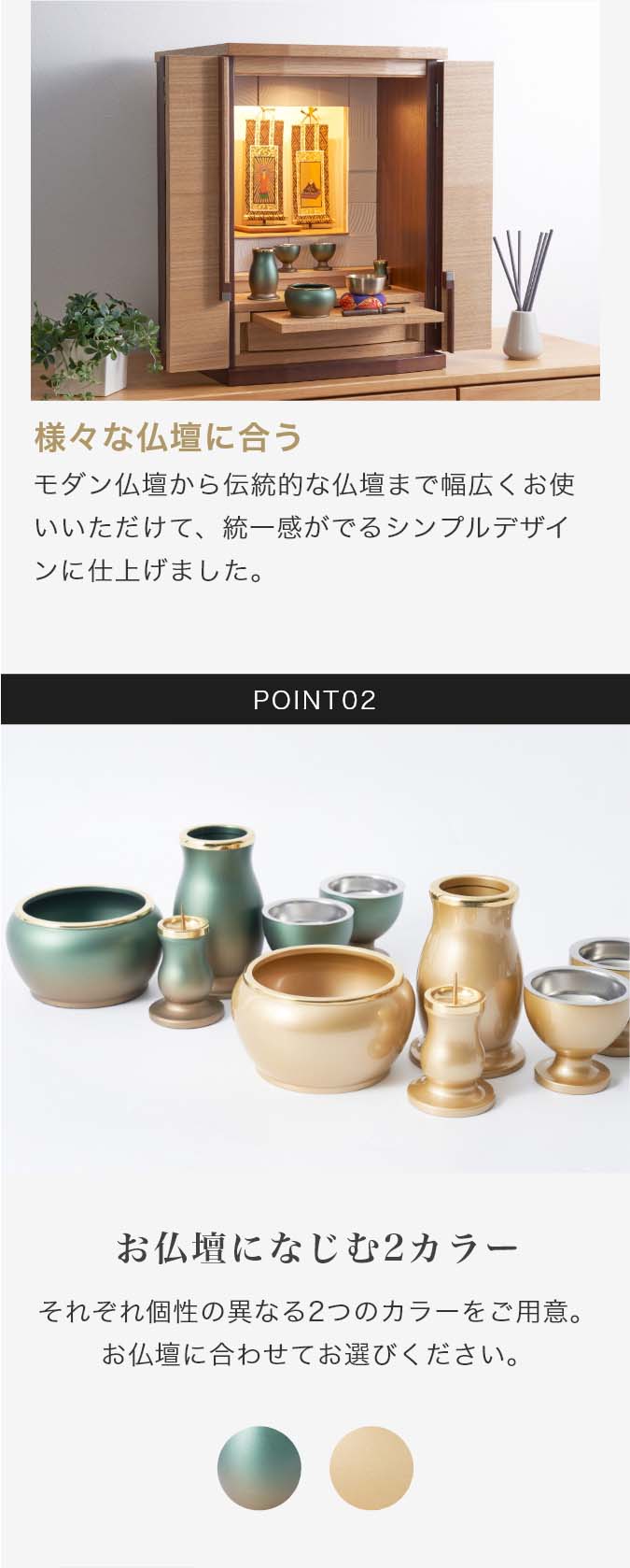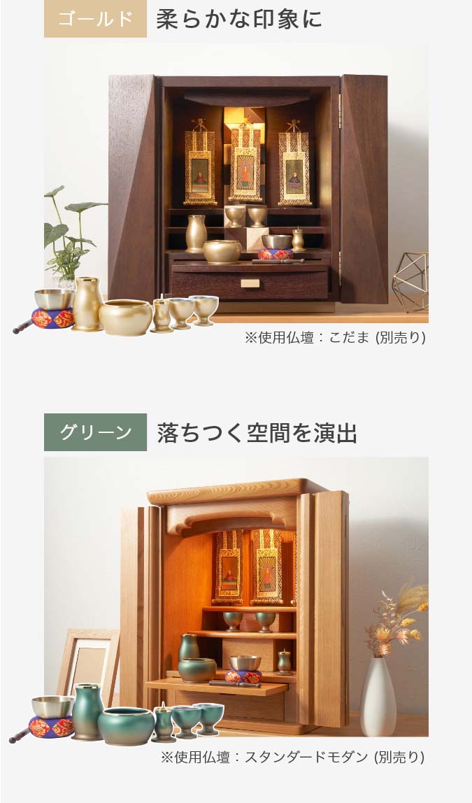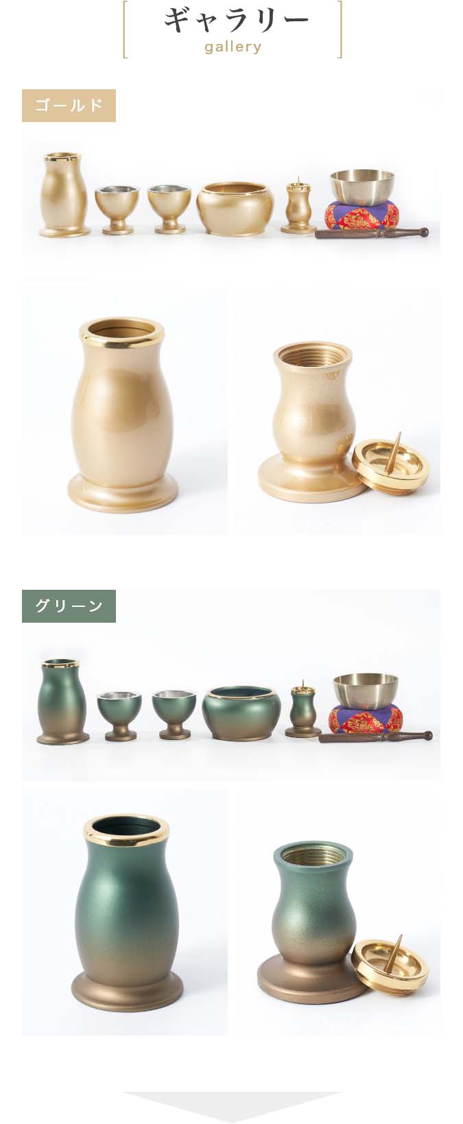 エール洋りん9点セットを購入。シックなグリーンで茶色の仏壇にとてもマッチしております。掛軸を仏像に変更しました。購入して良かったです。