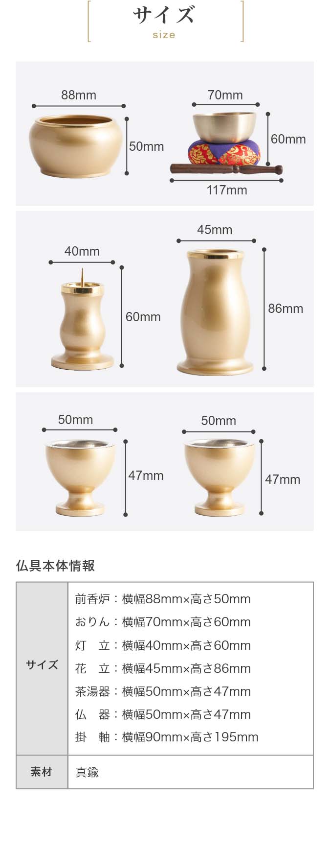 おりん:横幅70mm×高さ60mm 灯 立:横幅40mm×高さ60mm 花 立:横幅45mm×高さ86mm 茶湯器:横幅50mm×高さ47mm 仏 器:横幅50mm×高さ47mm 掛 軸:横幅90mm×高さ195mm |