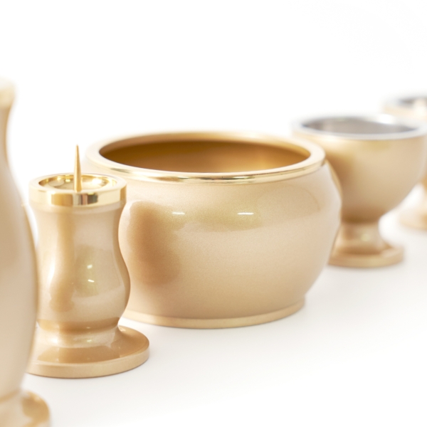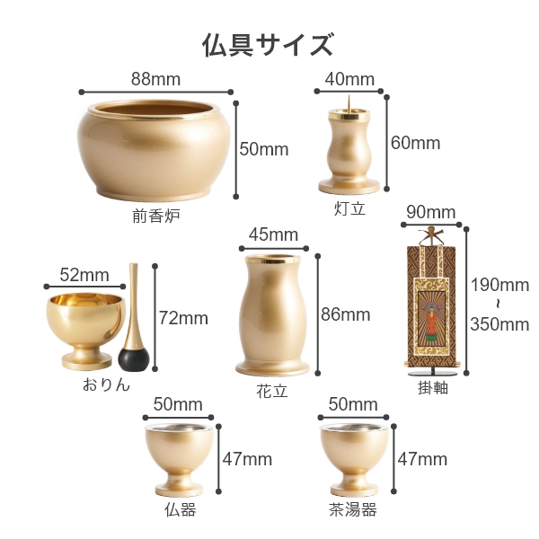 おりん:横幅52mm×高さ72mm 灯 立:横幅40mm×高さ60mm 花 立:横幅45mm×高さ86mm 茶湯器:横幅50mm×高さ47mm 仏 器:横幅50mm×高さ47mm 掛 軸:横幅90mm×高さ195mm |