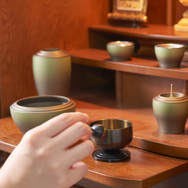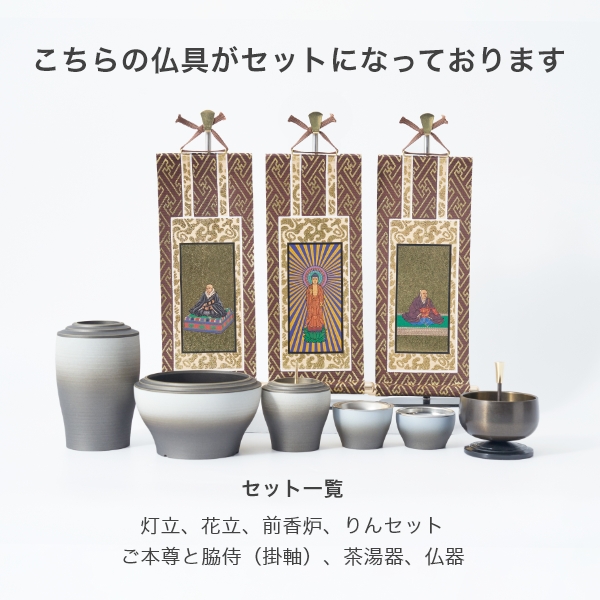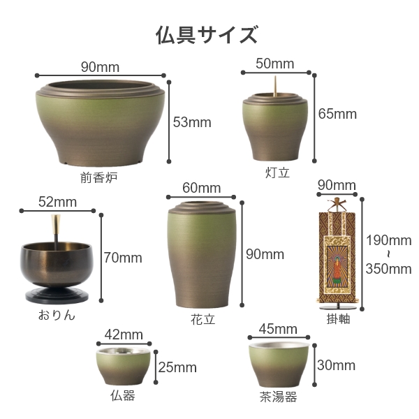 おりん:横幅52mm×高さ70mm 灯 立:横幅50mm×高さ65mm 花 立:横幅60mm×高さ90mm 茶湯器:横幅45mm×高さ30mm 仏 器:横幅42mm×高さ25mm 掛 軸:横幅90mm×高さ195mm |