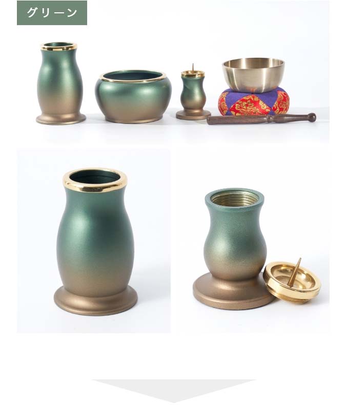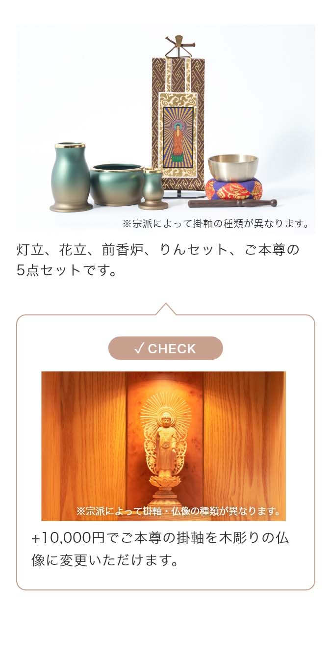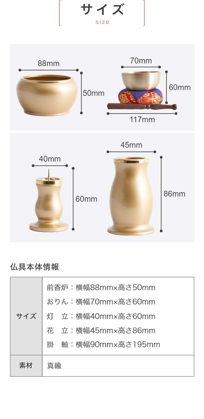 おりん:横幅70mm×高さ60mm 灯 立:横幅40mm×高さ60mm 花 立:横幅45mm×高さ86mm 掛 軸:横幅90mm×高さ195mm |
