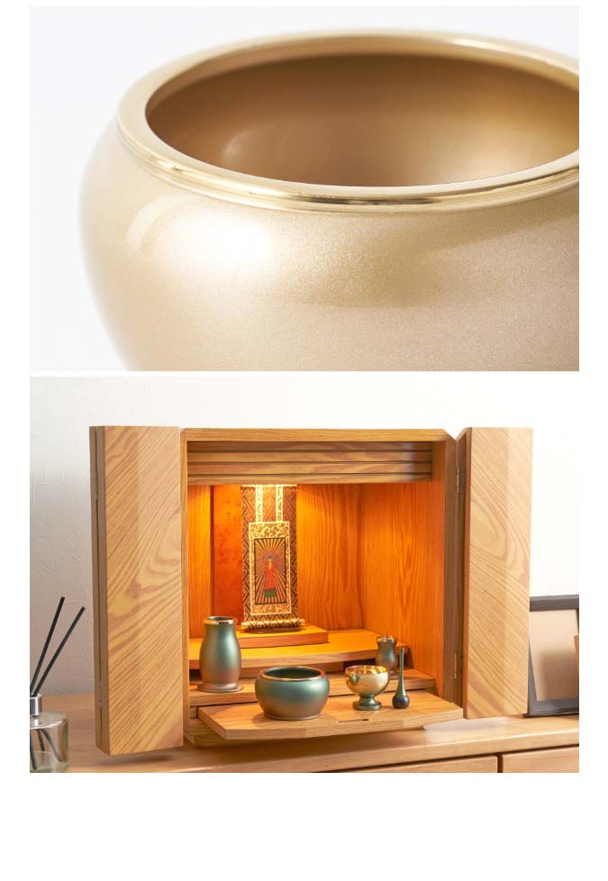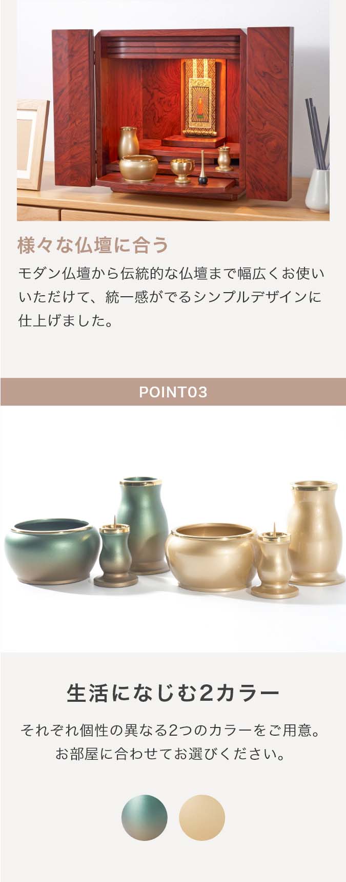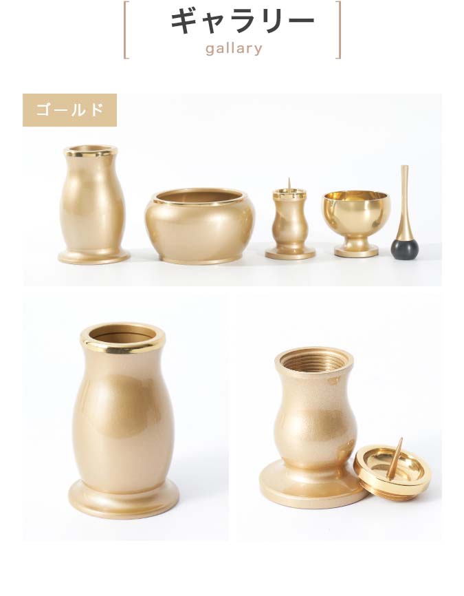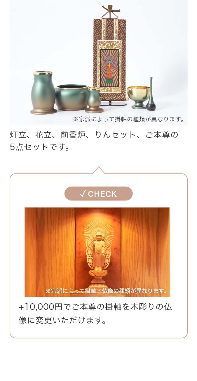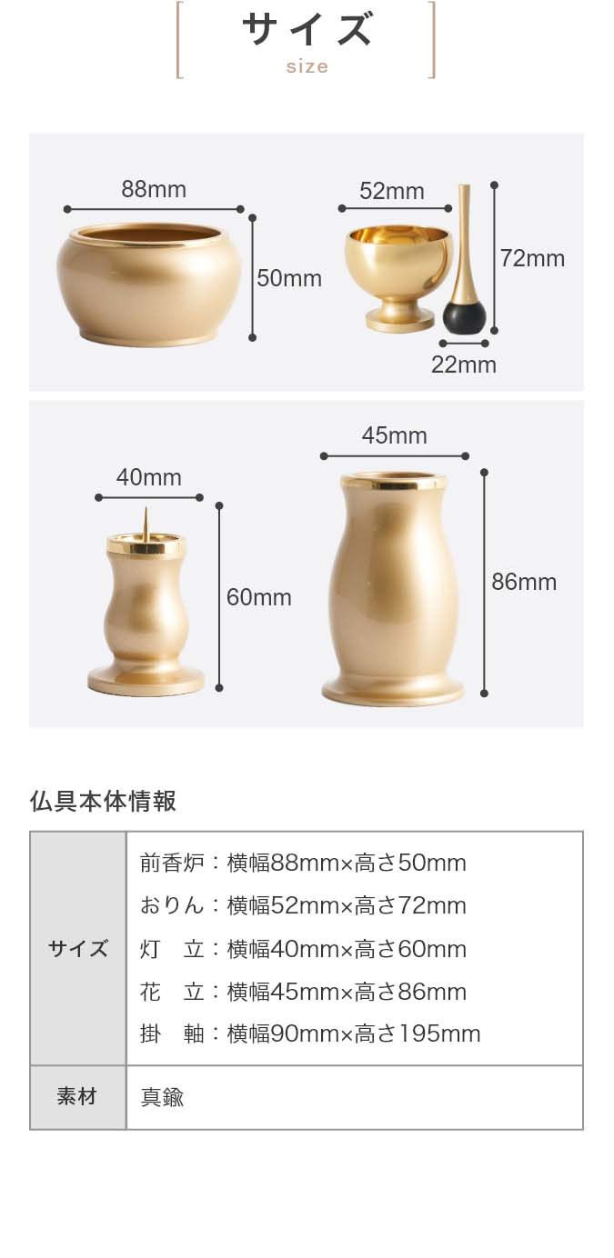 仏具セット「エール(洋リン)」の5点セットです。 付属内容:灯立、花立、前香炉、りんセット、ご本尊 +10,000円でご本尊の掛け軸を仏像に変更いただけます。 推奨仏壇サイズ:14号以下