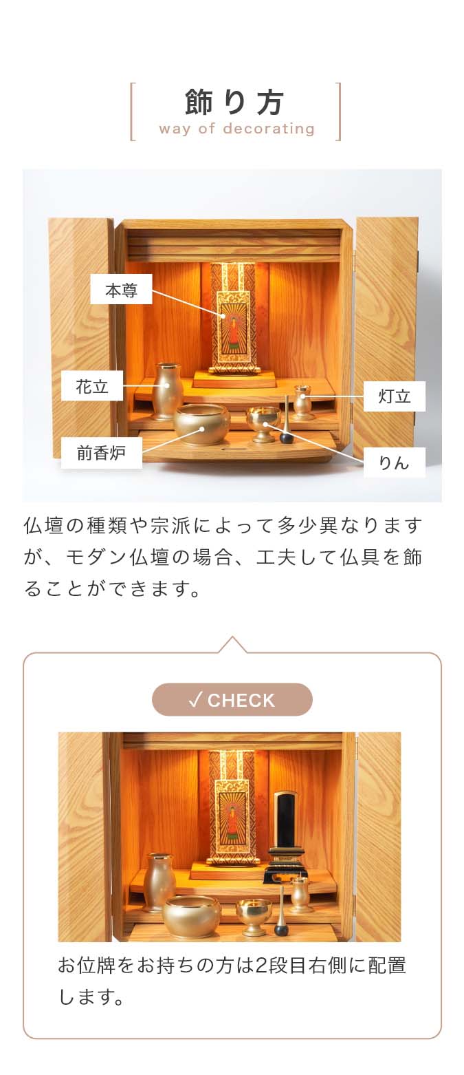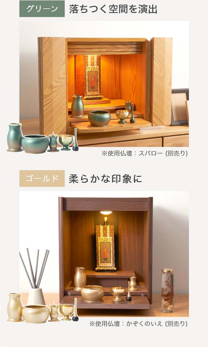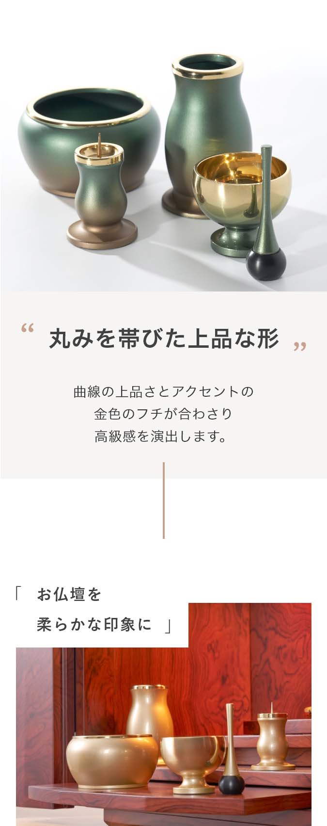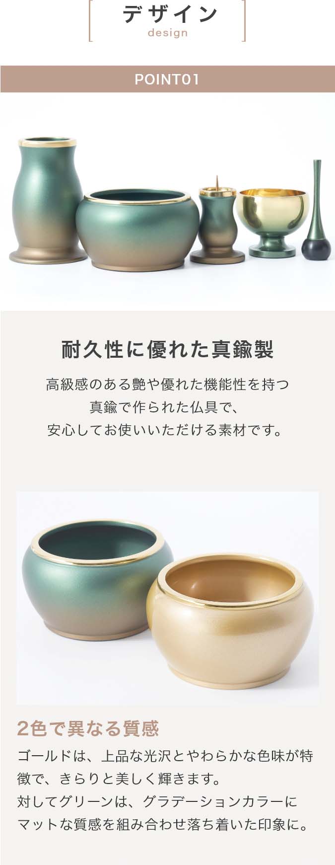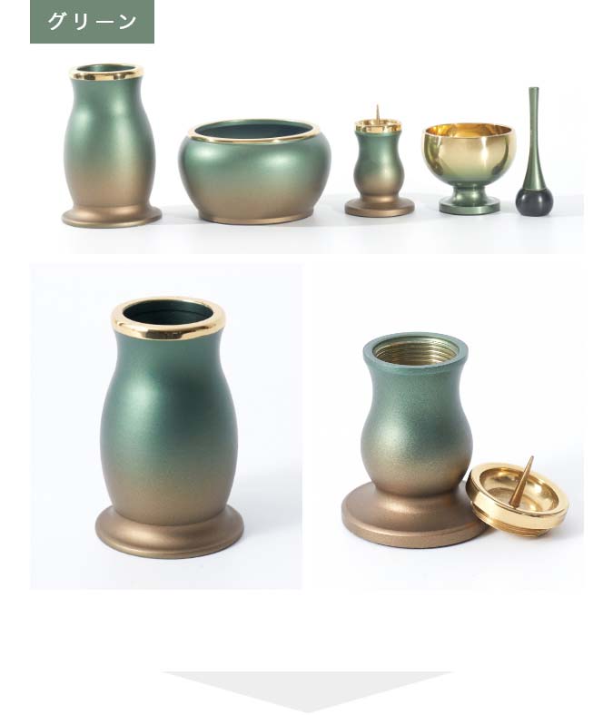仏具セット「エール(洋リン)」の5点セットです。 付属内容:灯立、花立、前香炉、りんセット、ご本尊 +10,000円でご本尊の掛け軸を仏像に変更いただけます。 推奨仏壇サイズ:14号以下