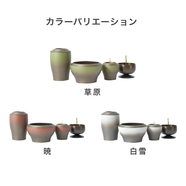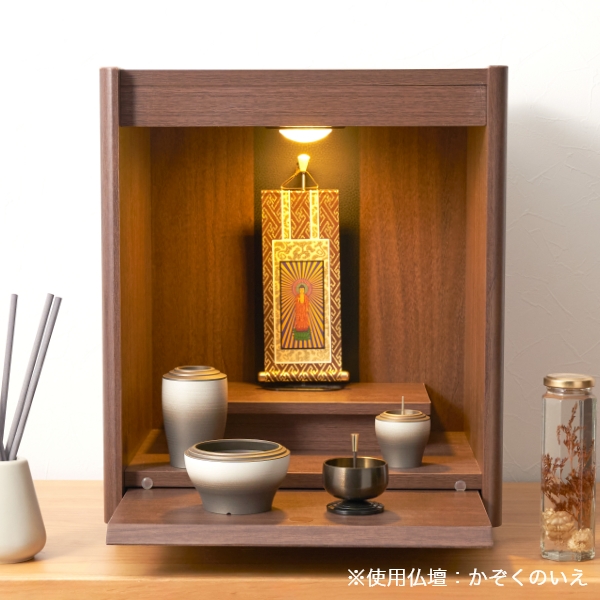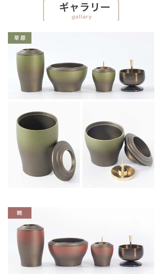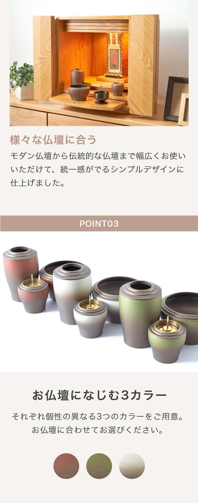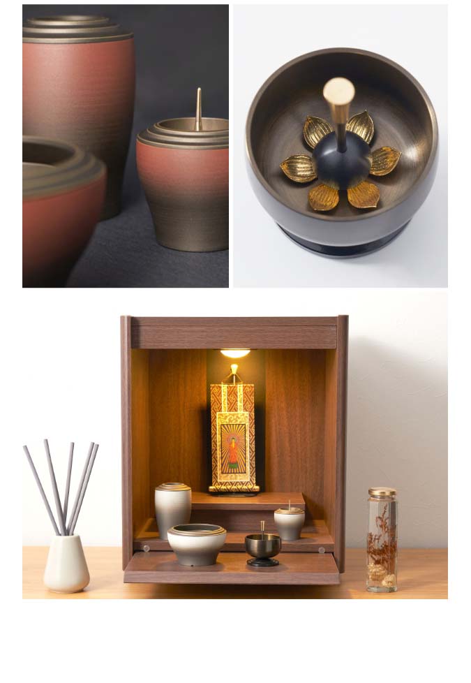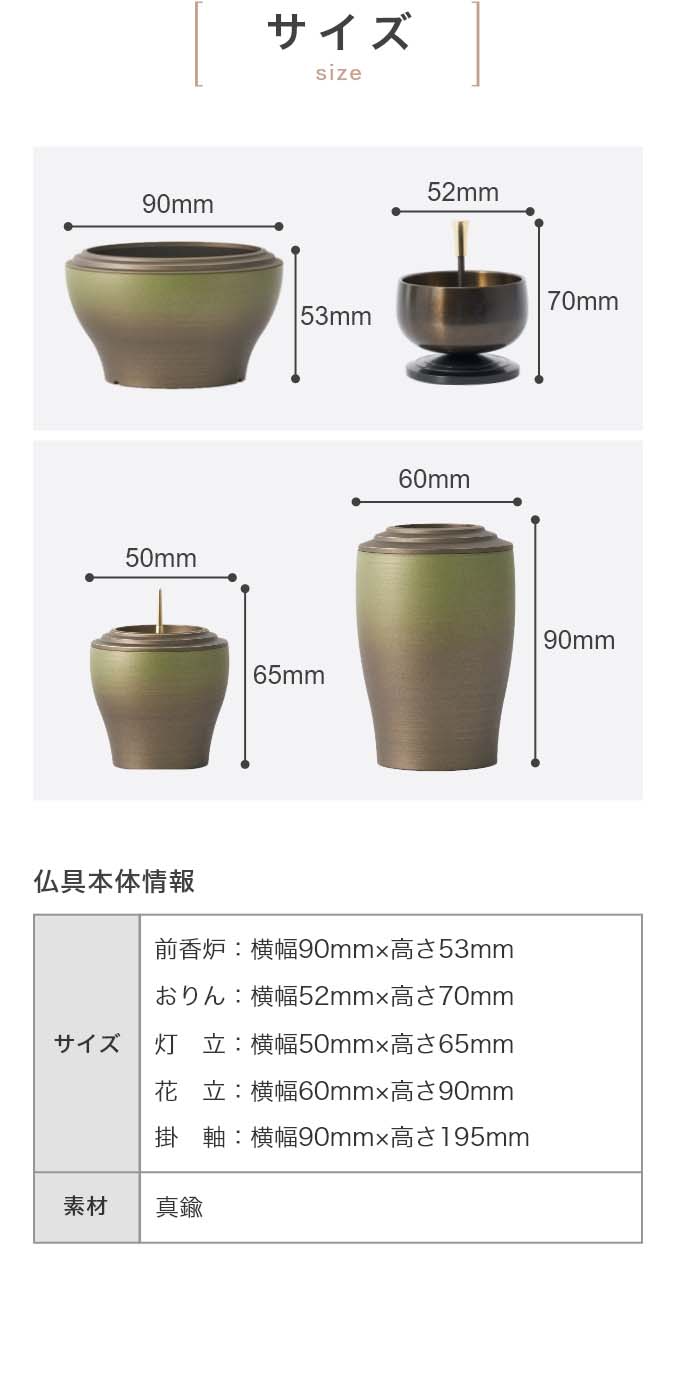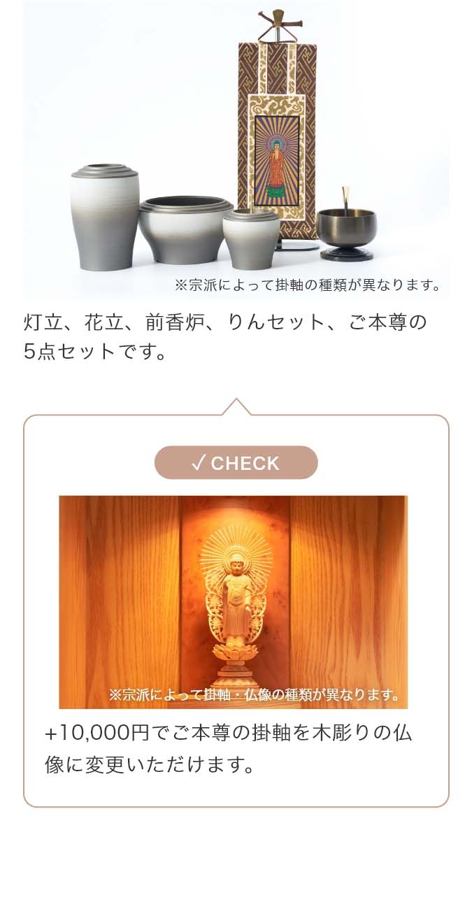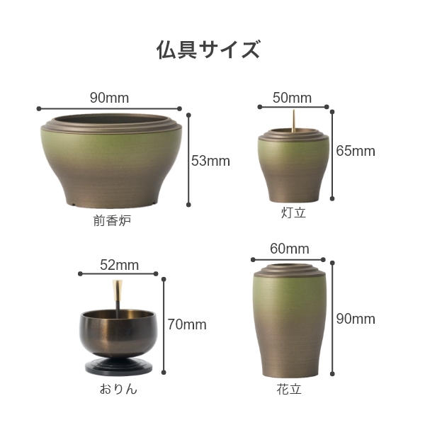 国内で作られた仏具セット「幽玄」の9点セットです。 さらさらとした触り心地と仏壇になじむグラデーションカラーが特徴的です。 付属内容:灯立、花立、前香炉、りんセット、ご本尊 +10,000円でご本尊の掛け軸を仏像に変更いただけます。 推奨仏壇サイズ:14号以下