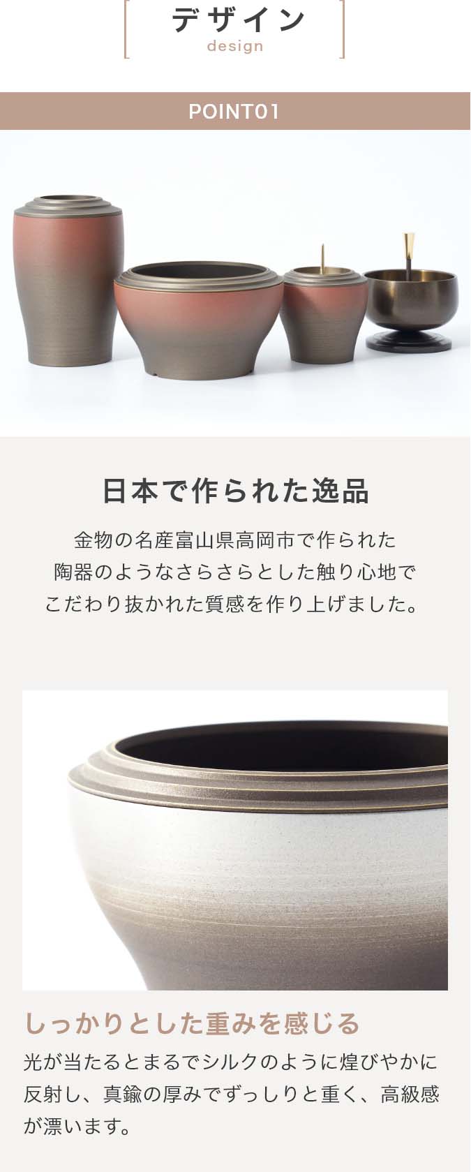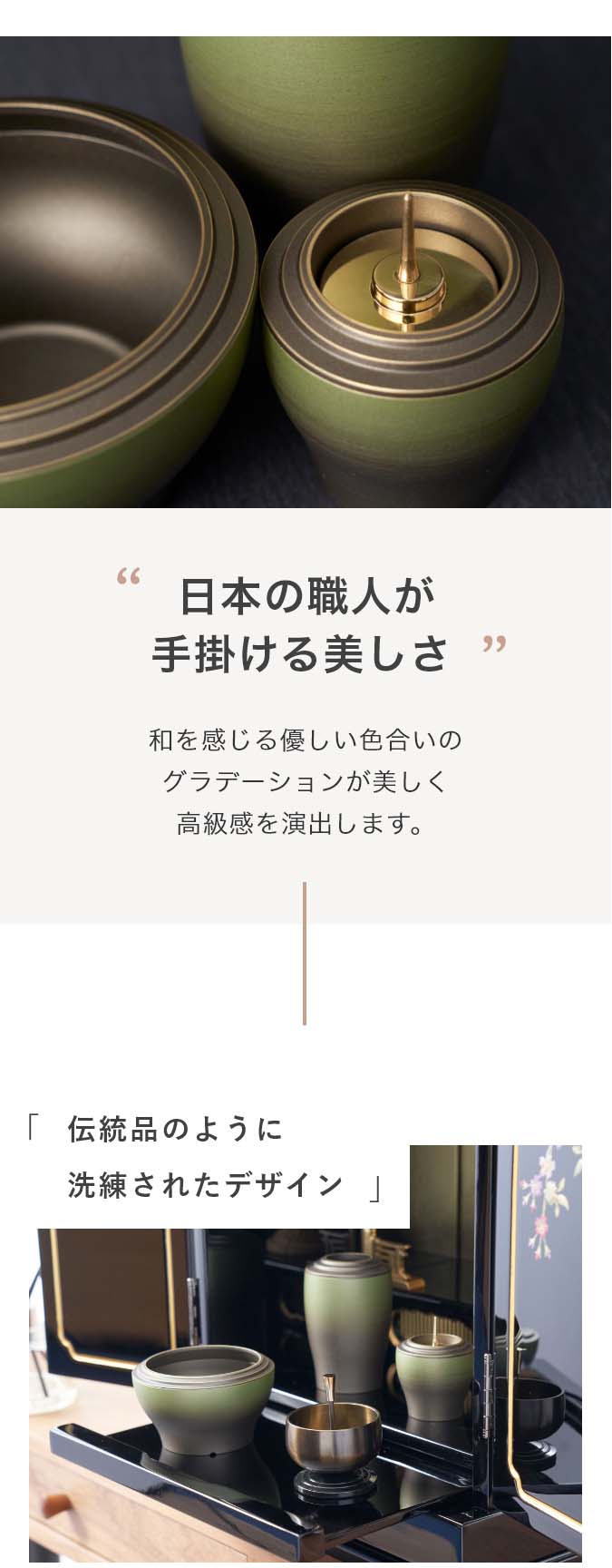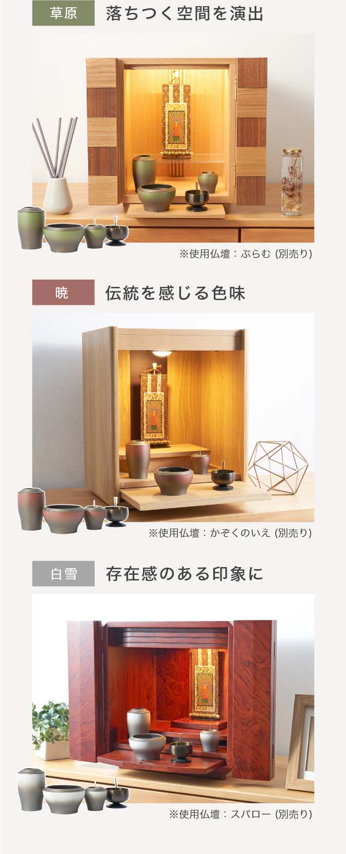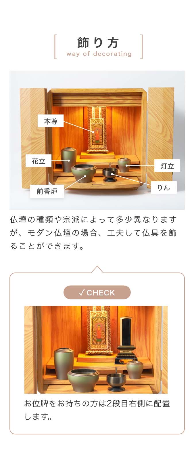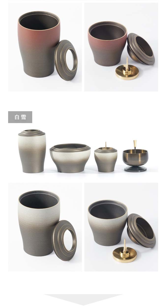 国内で作られた仏具セット「幽玄」の9点セットです。 さらさらとした触り心地と仏壇になじむグラデーションカラーが特徴的です。 付属内容:灯立、花立、前香炉、りんセット、ご本尊 +10,000円でご本尊の掛け軸を仏像に変更いただけます。 推奨仏壇サイズ:14号以下